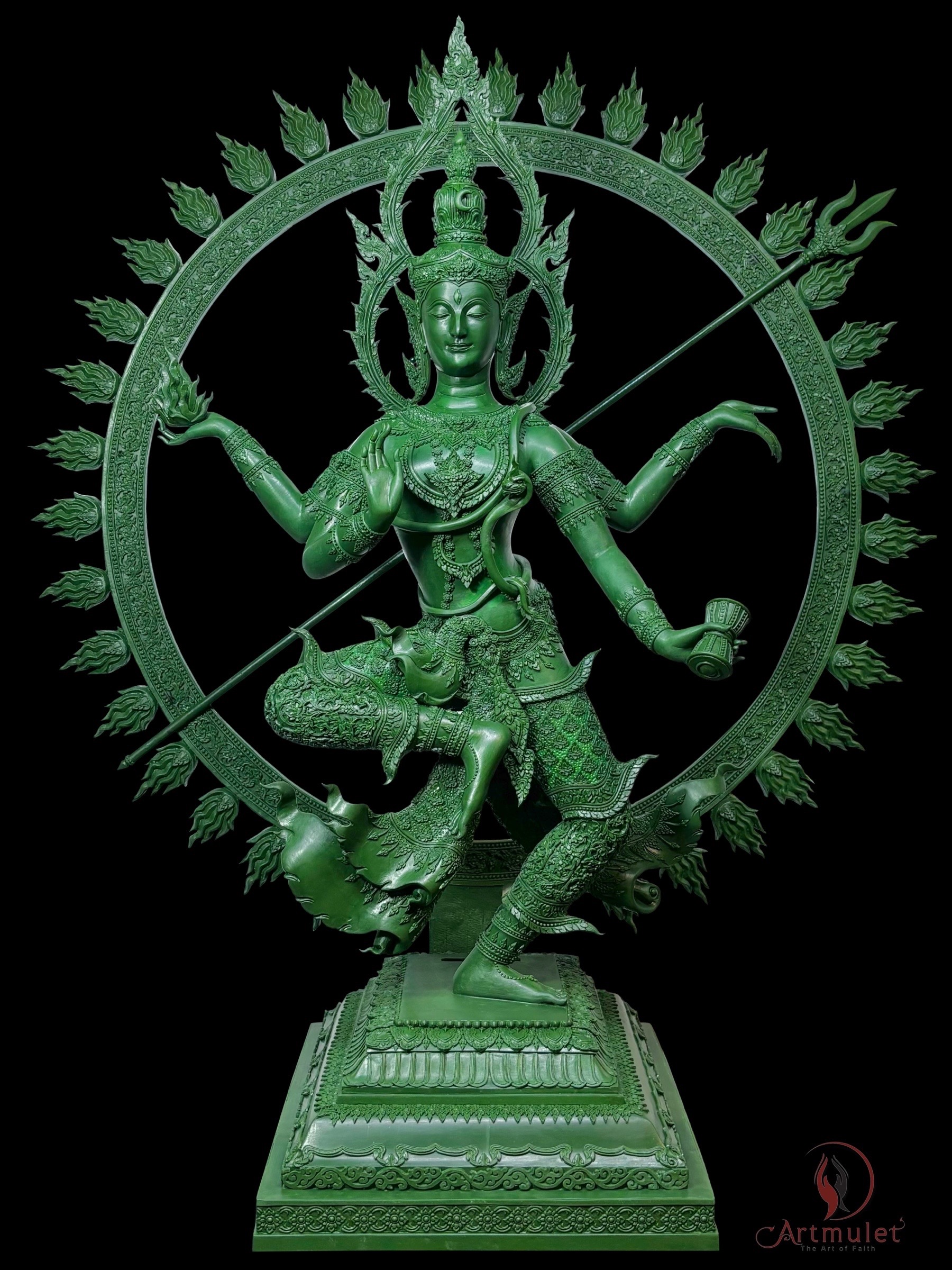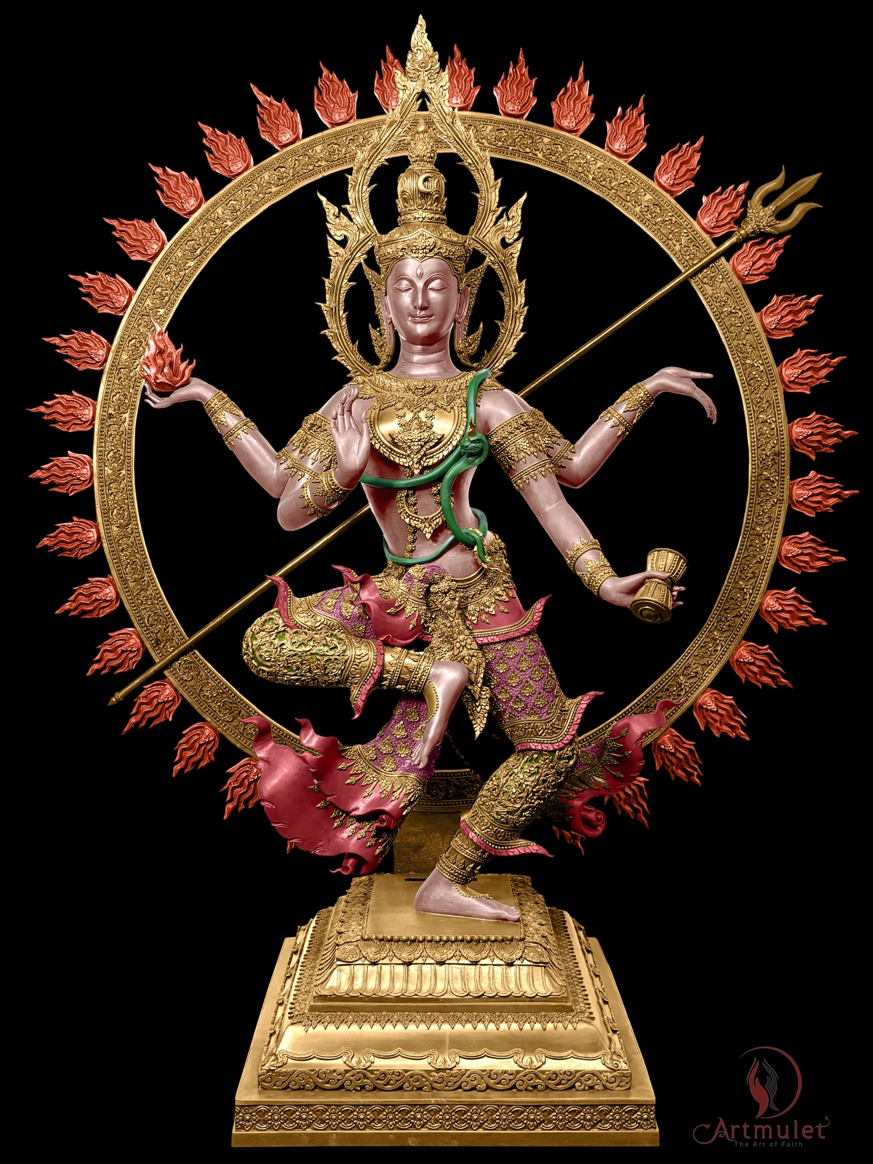 องค์พระอิศวรในท่วงท่าร่ายรำอันทรงพลัง แต่อ่อนช้อยตามแบบฉบับนาฏลีลา พระบาทข้างหนึ่งยกขึ้นอย่างอิสระ สื่อถึงการหลุดพ้นจากพันธนาการและความทุกข์ทั้งปวง ศิราภรณ์ กรองศอ ภูษาอาภรณ์ และรัศมีรังสรรค์ด้วยลวดลายไทยประยุกต์แสดงถึงความละเอียดอ่อนอันมีนัยยะถึงความมั่งคั่ง พระรัศมีแห่งธรรมที่เปรียบดังแสงทองส่องสว่างนำทางชีวิต พระหัตถ์ขวาบนทรงอัคนี ซึ่งเป็นไฟแห่งการทำลายล้างสิ่งเก่า พระหัตถ์ซ้ายบนทรงร่ายรำ ดั่งการใช้ชีวิตอย่างมีความสุขในทุกสภาวะแห่งการเปลี่ยนแปลง พระหัตถ์ขวาประทานพรด้วยท่าอภัยมุทรา ดั่งพระหัตถ์แห่งความสมดุลที่สื่อถึงว่า อย่าได้กลัวจงกล้าหาญที่จะเผชิญกับความเปลี่ยนแปลง พระหัตถ์ซ้ายล่างทรงบัณเฑาะว์ ประดุจการให้จังหวะแห่งการสร้างสรรค์ วงแหวนแห่งอัคนีรัศมีเปลวเพลิงที่โอบล้อมพระองค์ไว้ เปรียบเสมือนเพลิงไฟที่ลุกโชนโชติช่วง ประดุจวัฏจักรแห่งกาลเวลาที่ไม่เคยหยุดนิ่ง และยังสื่อถึงพลังอำนาจที่จะเผาผลาญอุปสรรคที่ขัดขวางการเปลี่ยนแปลงทั้งหลายให้หมดสิ้นไป