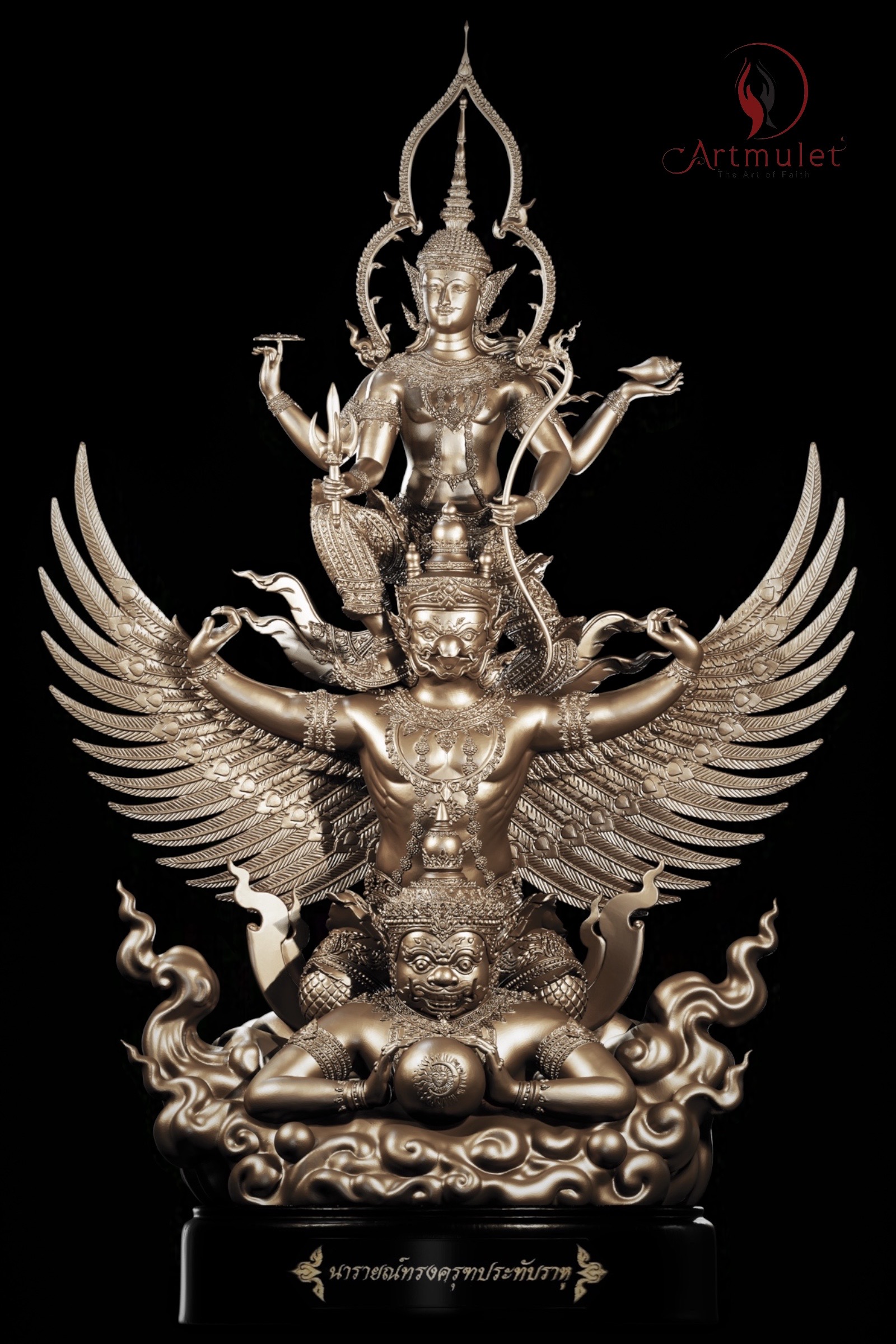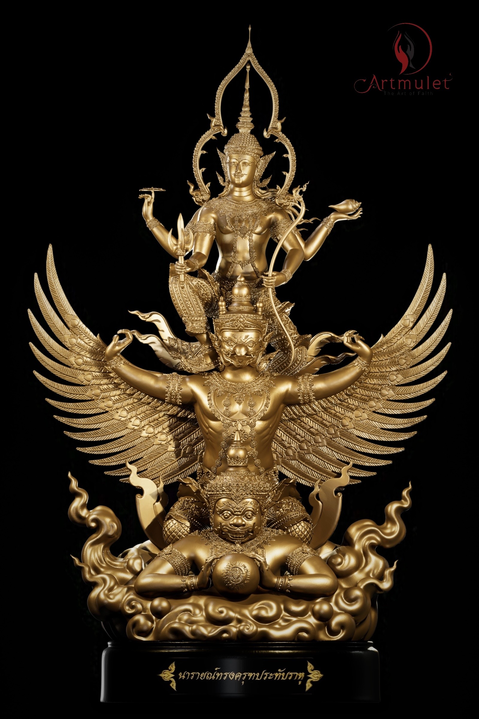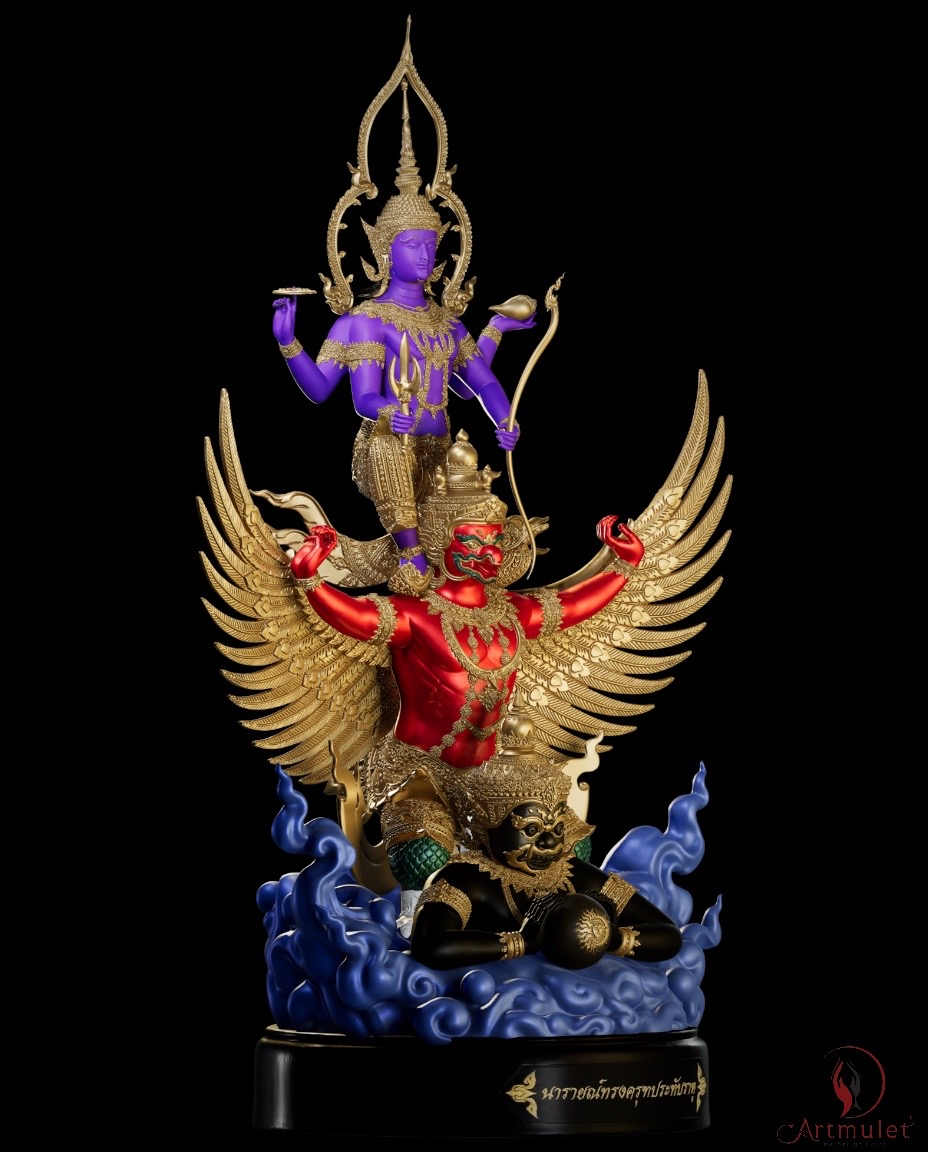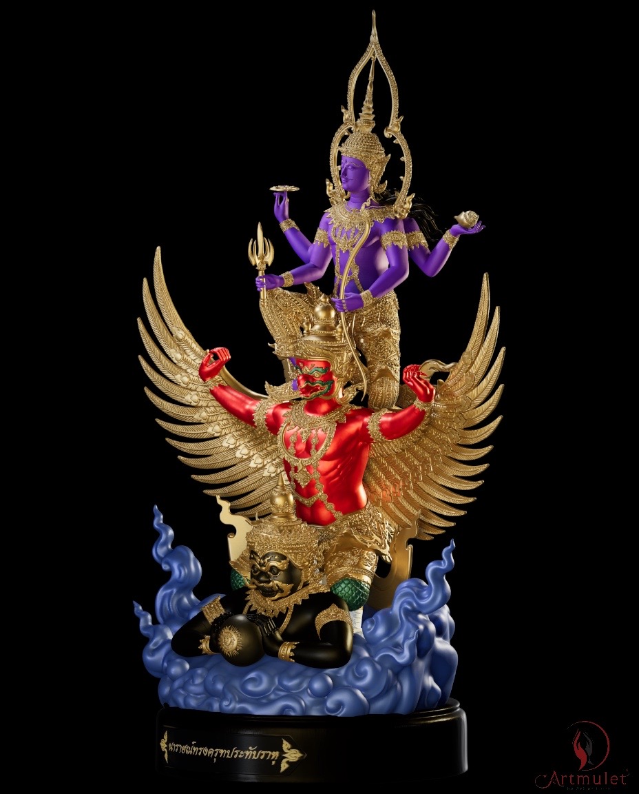 ดังนั้นผลงานประติมากรรม "พระนารายณ์ทรงครุฑประทับราหู" จึงไม่ใช่เป็นเพียงผลงานประติมากรรมเทวะศิลป์ชั้นสูงเท่านั้น แต่ยังเป็นสัญลักษณ์แห่งคุณความดีที่สยบอำนาจแห่งความชั่วร้ายทั้งปวง ทั้งนี้เพื่อเป็นขวัญกำลังใจแก่ผู้ศรัทธา และยังเป็นเครื่องอุปเท่ห์ในการที่จะดำรงชีวิตและประกอบสัมมาชีพ ด้วยคุณธรรมความดี อันจะนำพาความสุขความสำเร็จสมปรารถนา มาสู่ผู้ที่ได้มีไว้ในครอบครอง รวมถึงเพื่อเป็นสมบัติของวงศ์ตระกูลสืบไปด้วย โดยผลงานดังกล่าวนี้เกิดขึ้นจากแนวคิดของ อ.ธนทัศน์ ทองเนียม ประธานดำเนินงานแห่ง ARTMULET และ ดร.ทรงพล เขมะบุลกุล ที่ปรึกษาโครงการ ผ่านจิตรกรเอก อ.เกรียงกมล นาคบางแก้ว และประติมากรชั้นครู อ.สุชาติ แซ่จิว สองศิลปินผู้รังสรรค์ปั้นแต่งผลงานในครั้งนี้ได้อย่างน่าอัศจรรย์ ทั้งความประณีตงดงาม วิจิตรบรรจง และรายละเอียดที่ดูพลิ้วไหว ทรงพลัง ทั้งหลายทั้งปวงนี้เพื่อฝากไว้ให้เป็นสมบัติอันล้ำค่าของคนไทยสืบไป